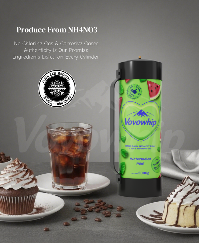 At Vovowhip, we specialize in high-quality food-grade nitrous oxide, crafted to meet the needs of both home cooks and professional foodservice providers. Vovowhip Cream Charger stands out for its purity: made from NH4NO3, it contains no corrosive gases like chlorine, ensuring a clean, safe, and environmentally friendly option for all culinary applications.