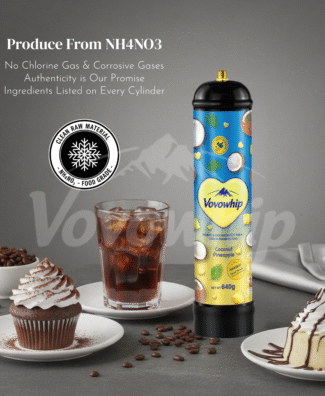 Vovowhip gas is produced by thermally decomposing NH4NO3, ensuring high purity. All ingredients are listed on each cylinder, and the N2O is free from chlorine and other corrosive gases.